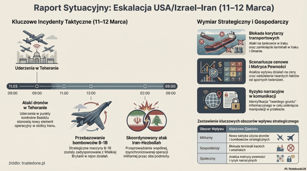 In the past 24 hours, the conflict has shifted into a phase of total economic warfare and direct strikes against Iran’s internal security structures. Attacks on port infrastructure in Basra and Oman have cut off key raw material export routes, neutralizing the IEA’s attempt to calm the markets. Israel, utilizing drones, has moved operations to the heart of Tehran, targeting Basij militias, aimed at destabilizing the regime from within amid calls by Reza Pahlavi for a general strike.