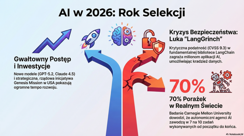 Wpływ rynkowy i regulacyjny jest wyraźny. European Commission przesunęła 19.11.2025 obowiązki dla systemów wysokiego ryzyka[20], łagodząc zasady anonimizacji i uproszczając reguły cookies, co ma zwiększyć konkurencyjność UE. Na rynku powstają standardy techniczne: Linux Foundation stworzyła Agentic AI Foundation[6] i promuje Anthropic Model Context Protocol (MCP) jako sposób na interoperacyjność agentów. W międzyczasie Service. Now przejęła Veza (transakcja szacowana na $2.7B)[22], a firmy bezpieczeństwa, takie jak Rubrik, odnotowują wzrost popytu na narzędzia audytu AI. Wnioski są jasne: 2026 będzie rokiem selekcji — przetrwają systemy z solidnym governance, audytem i bezpieczeństwem.