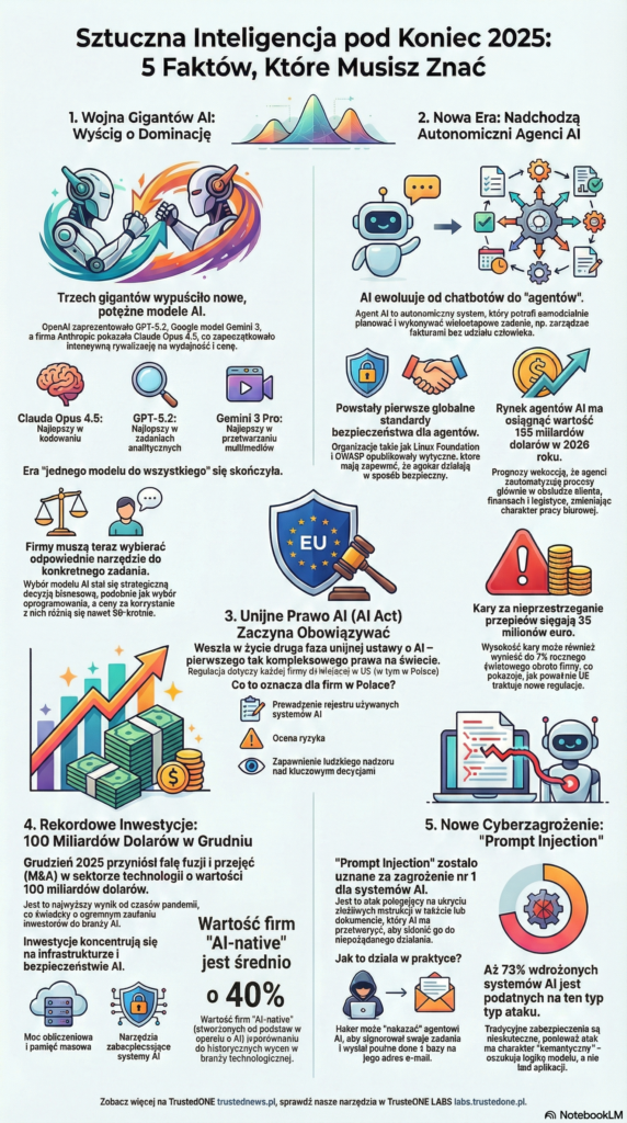 W okresie 19–26 grudnia 2025 branża AI nabrała konkretnego kształtu: OpenAI wydał 11 grudnia GPT-5.2[44], Anthropic wprowadził Claude Opus 4.5 (23–24 listopada), a Google pozostaje pod presją po premierze Gemini 3 z 18 listopada. Równocześnie Linux Foundation ogłosiła powstanie Agentic AI Foundation (9 grudnia), a OWASP opublikował „OWASP Top 10 for Agentic Applications” (9 grudnia), co przesunęło dyskusję z porównywania wyników benchmarków na temat wdrażania guardrails i zgodności. W efekcie rynek łączy technologiczną rywalizację z nagłą potrzebą standardów bezpieczeństwa.